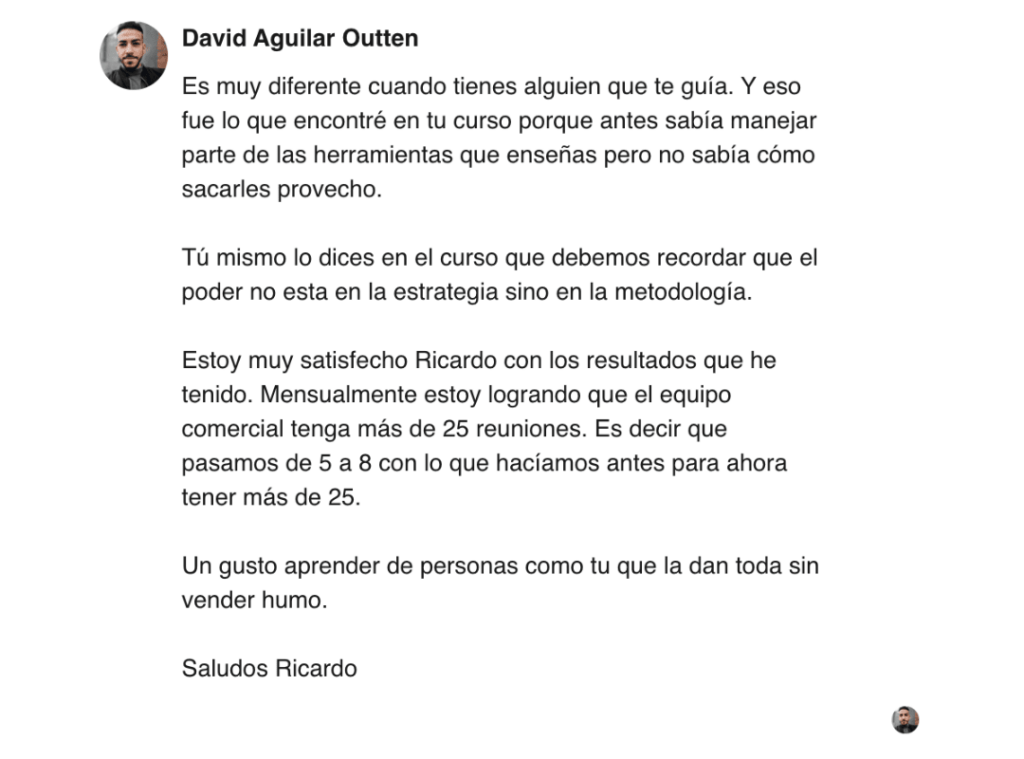 Generarás gradualmente reuniones con tomadores de decisión de empresas todos los meses, aprendiendo a usar herramientas de semi-automatización, inteligencia artificial y plantillas efectivas para crear contenido orgánico efectivo